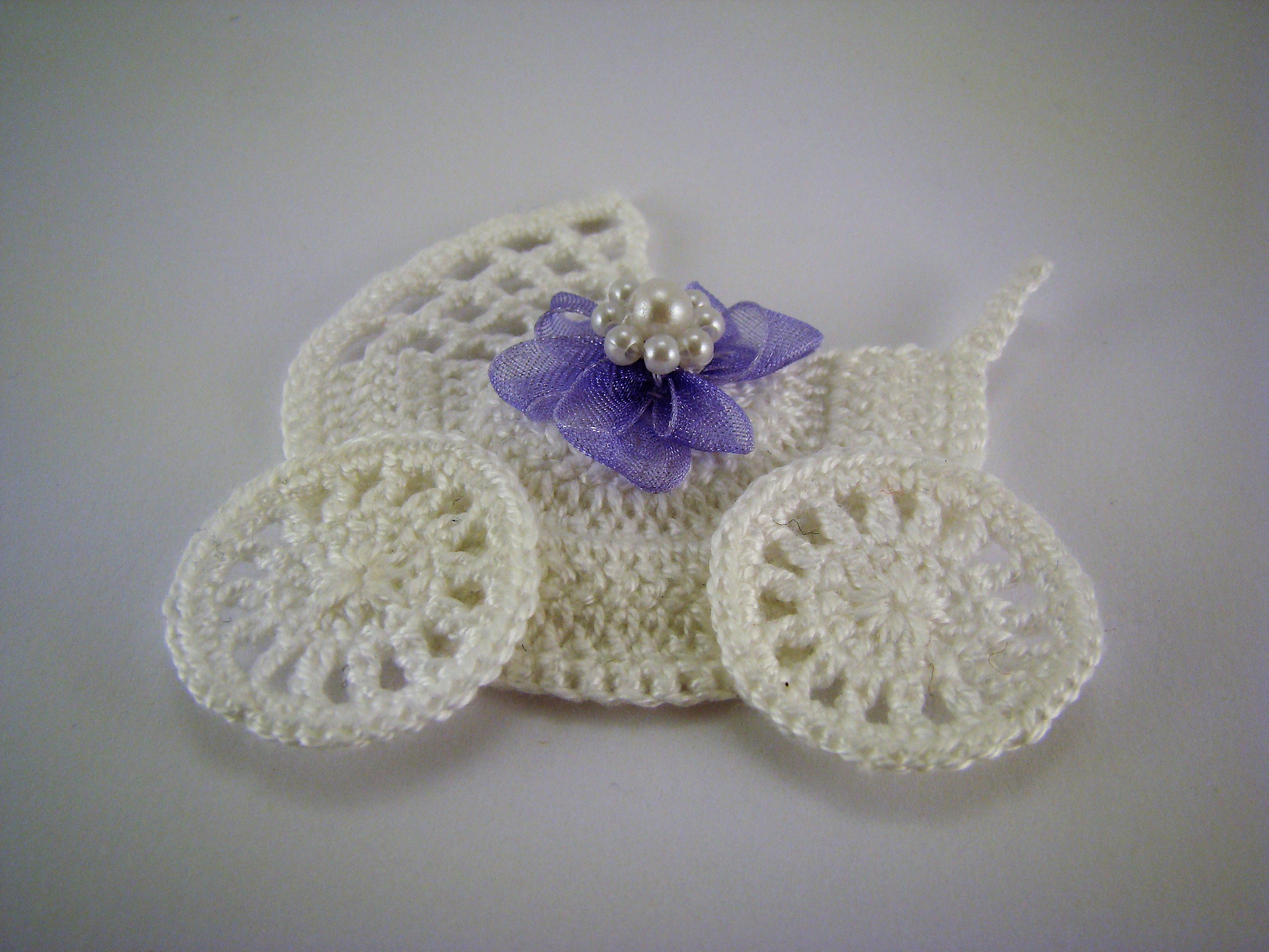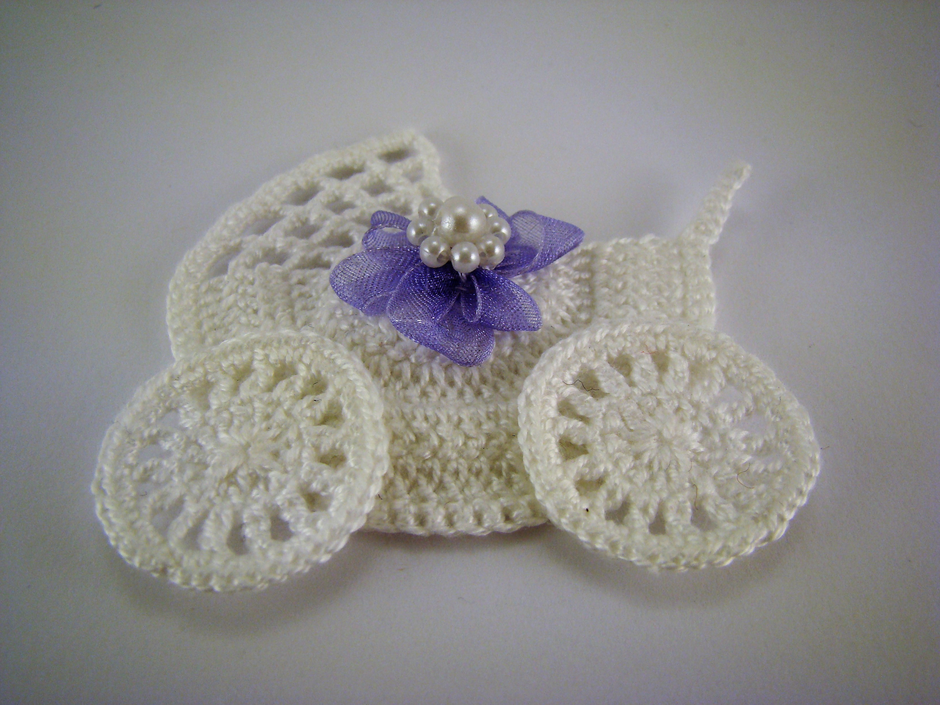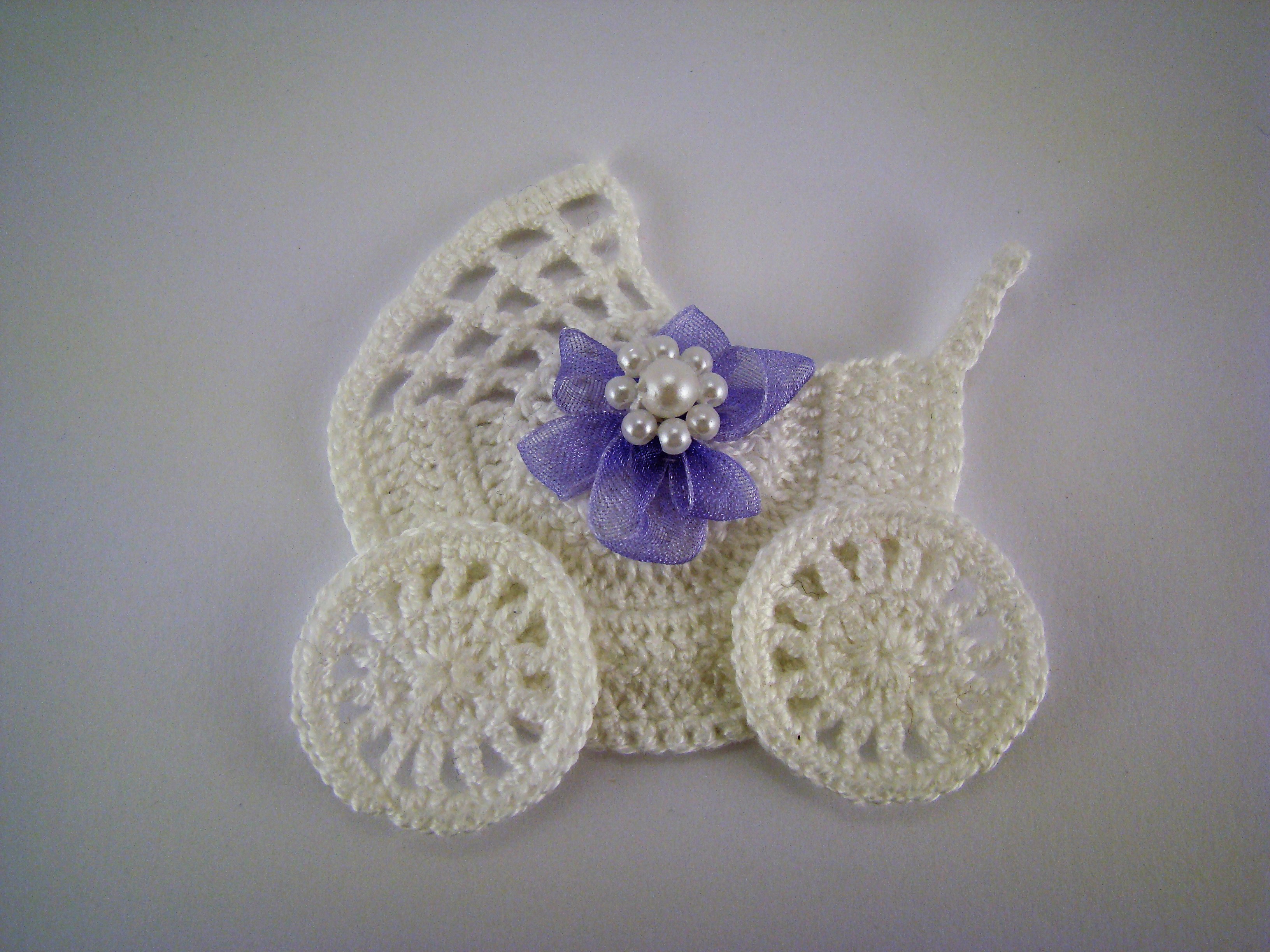 Carrinho de bebé miniatura em crochet, algodão n.º 12, cor branca, com flor lilás